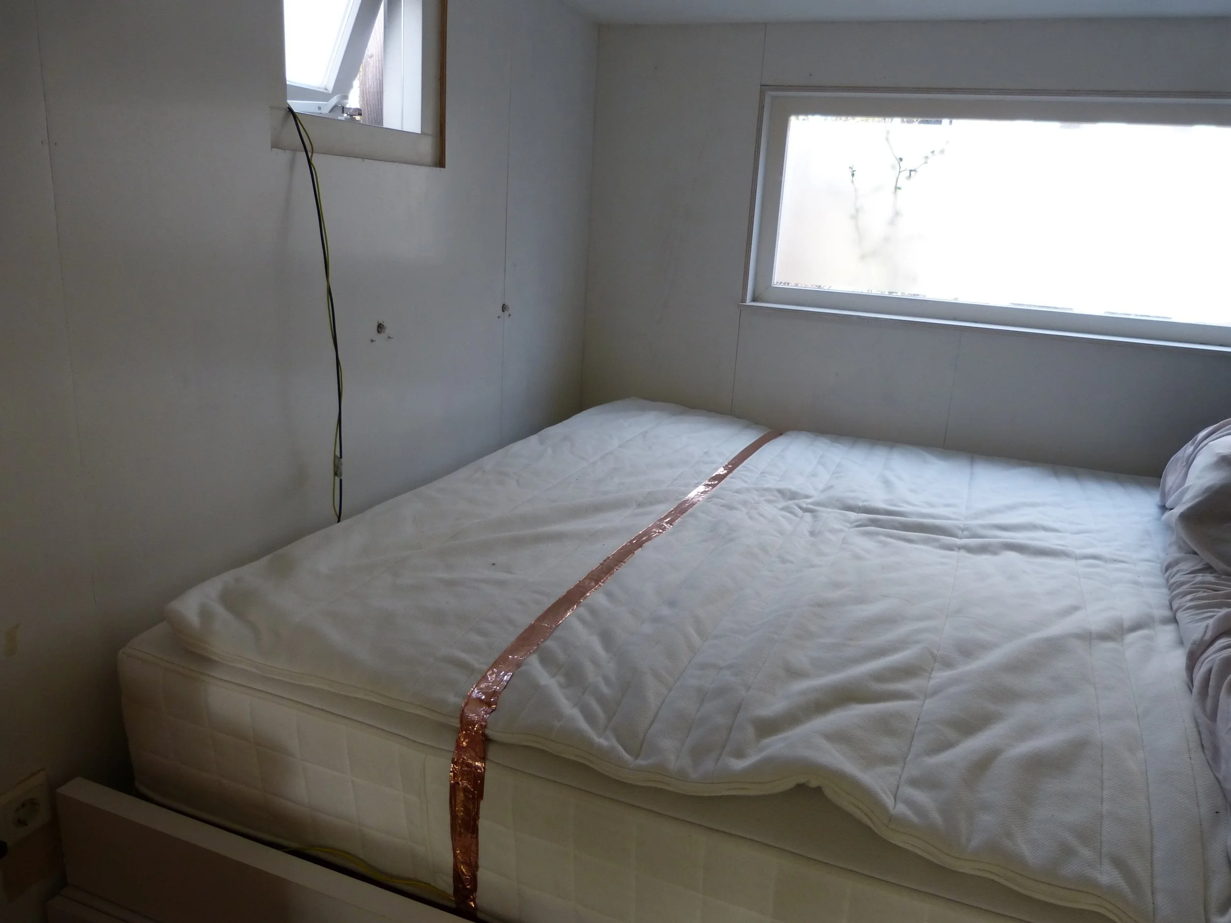 Een simpele manier om jezelf voor langere tijd te verbinden met de aarden is je matras omwikkelen met metaaltape en deze tape verbinden met een draad die naar buiten loopt en vastzit aan een metalen pin.